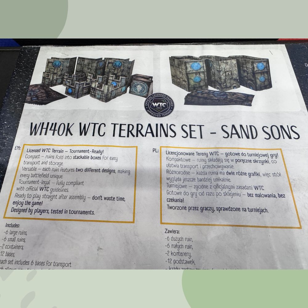 Przenieś swoje rozgrywki Warhammer 40,000 na zupełnie nowy poziom dzięki oficjalnie licencjonowanemu zestawowi terenów WTC Sand Sons. To kompletne rozwiązanie dla graczy, którzy cenią sobie idealny balans między estetyką, klimatem a turniejową precyzją. Motyw "Sand Sons" przywodzi na myśl starożytne grobowce, pustynne ruinny i mistyczną architekturę, która doskonale komponuje się z każdą armią – od Marines, przez Nekronów, aż po siły Chaosu.